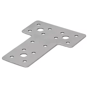 Flat t-shape plate for connecting timber at 90° right angles. Nails or countersunk screw fixing. Tough, non-corrosive coating for durability. Ready to paint without priming or pre-treatment. More environmentally friendly than zinc-plated products. 2 hole sizes for fixing options.