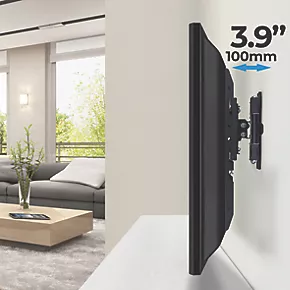 Get complete control of the TV position with this full motion wall mount for larger screens. Ideal for moving the screen around, or to place it in a media wall or in a corner. Turn the screen left or right (±90°) and tilt it up or down (-8 to 18°). Extend the TV outwards for easy access to cables, or push it back neatly against the wall. The large mounting rail is compatible with a wide range of VESA sizes and allows extra left-right adjustment. The mount is fitted in 2 sections, one to the TV and one to the wall. Simply lift and hook the TV onto the wall mount, then tighten the 2 locking screws to secure it. Includes a cable management strap to keep cables tidy.